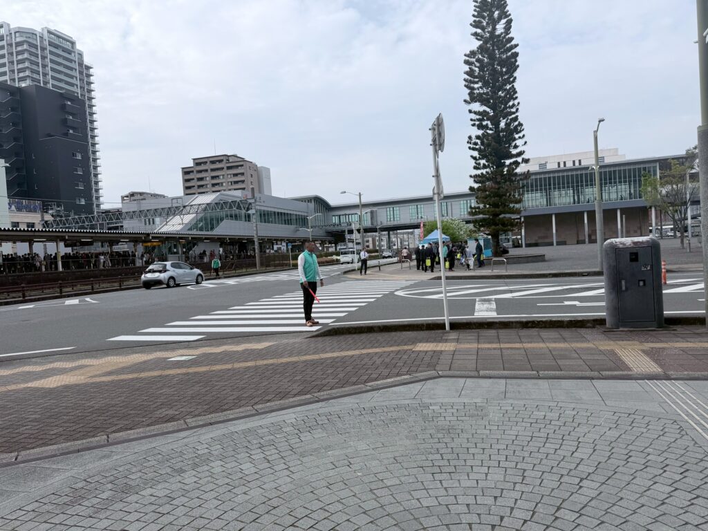 メンバーは各部署でおもてなしの誘導をいたしました。JR清水駅東口からマリナートへと続く交差点です。駅の近代的なペデストリアンデッキを背景に、誘導灯を手に横断歩道の脇に立ちます。日曜日の朝ということもあり、駅周辺は大会参加者だけでなく、一般の観光客や市民の皆様の往来も激しい状態でした。