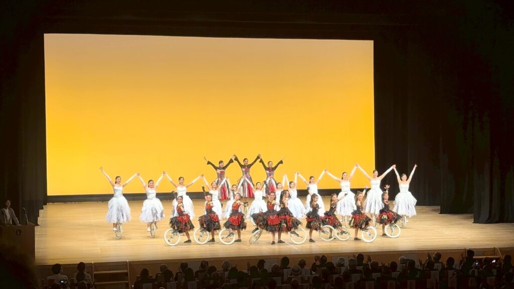 黄金色のステージ照明の下、純白のドレスと赤・黒の力強い衣装を纏った選手たちが、一輪車とは思えないほど優雅に、そして力強く舞いました。手を取り合い、一列に並んでポーズを決めるその姿は、まさに芸術そのものです。全国大会3連覇を成し遂げたという名門ならではの、一糸乱れぬパフォーマンスに、満員の客席からは割れんばかりの拍手が送られました。
