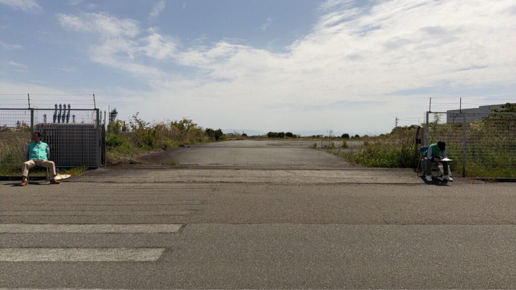 資料によれば、今日は計9台のバスが各地から到着します。駐車場係のメンバーは、それらが到着するまでの間、入り口のゲートを守り続けなければなりません。舗装された地面からの照り返しが、水分を揮発させ体力を削っていきます。周囲には遮るものもなく、ただ遠くに貯蔵タンクと山々が望めるだけです。
